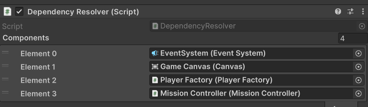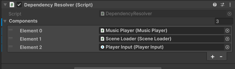 To manage dependencies, I use additive scene loading and a DependencyResolver component. The first scene to load is the “Global” scene. This will never be unloaded, and contains any systems you want to persist for your entire game. In a basic example, the Global scene contains a “Music Player”, a “Global Dependency Resolver”, a “Scene Loader” and a “Player Input” GameObject. Each one of these has a respective component. (Or two, eg in the case of Music Player, it also has an AudioSource) I prefer a flexible hierachy of different GameObjects, and usually one per system, instead of one bloated GameManager component or object. The GlobalDependencyResolver is quite simple, it is a list of references to components on objects, in this case, it contains a reference to musicPlayer, SceneLoader, and Player Input.