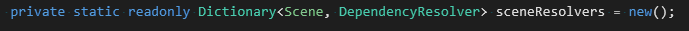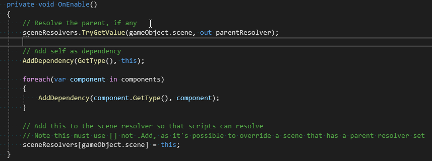 A note about scene loading, it’s important that the dependency for a scene is set before it finishes loading. This can be achieved by calling Scenemanager.LoadSceneAsync, and then immediately afterwards, resolving the scene. Unity scene loads always take at least one frame to complete, so this is safe.