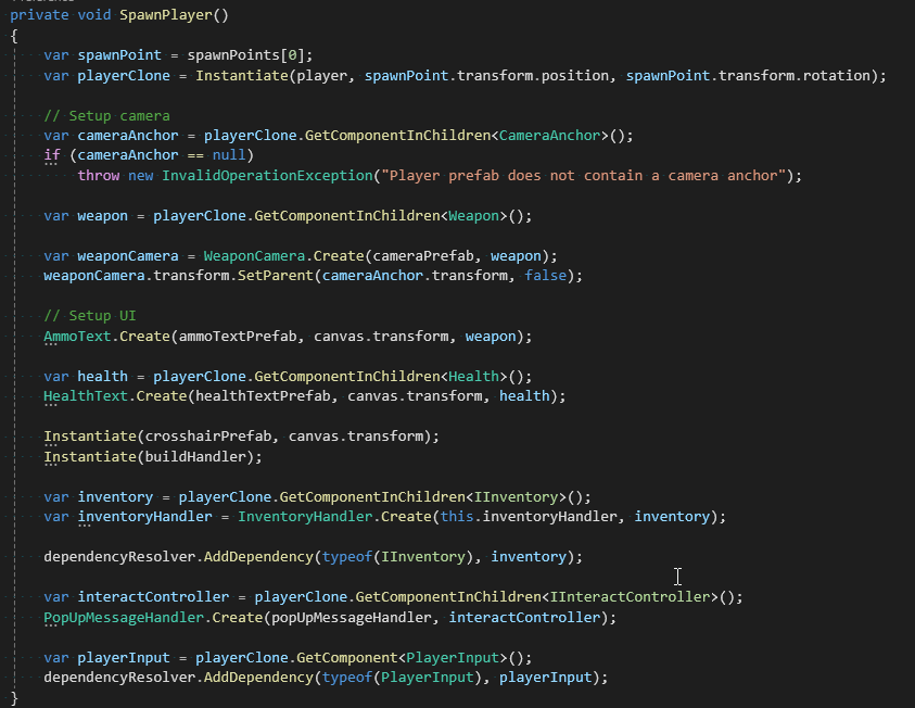As I add more logic and complexity to my player spawning, I can simply add the extra prefabs/dependencies to PlayerFactory and spawn things as needed.