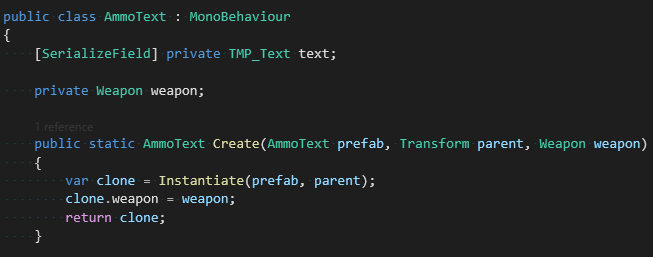 Now about that PlayerFactory, what does it do? It spawns the player of course, but why is this necessary? Well, various components need to be hooked up to the player. For example, UI prefabs displaying text, health, ammo count, a crosshair, etc. I like to keep my UI code seperated from gameplay, so that game code does not have knowledge of UI, but simply exposes read-only variables, such as current ammo etc. So our player factory can create the player, get its weapon component, and then create an AmmoText prefab, passing that weapon as an argument.