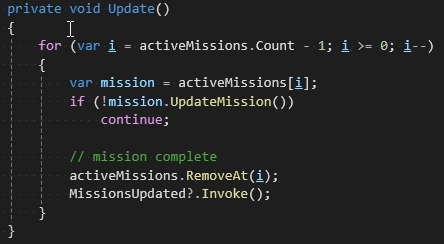 I also have a MissionController that you may have seen earlier. This could take on other names such as quest manager, game controller, etc.. This simply tracks an active mission (Or missions), updates it, checks for completion, and if so, removes it from the list and invokes its on completion function.